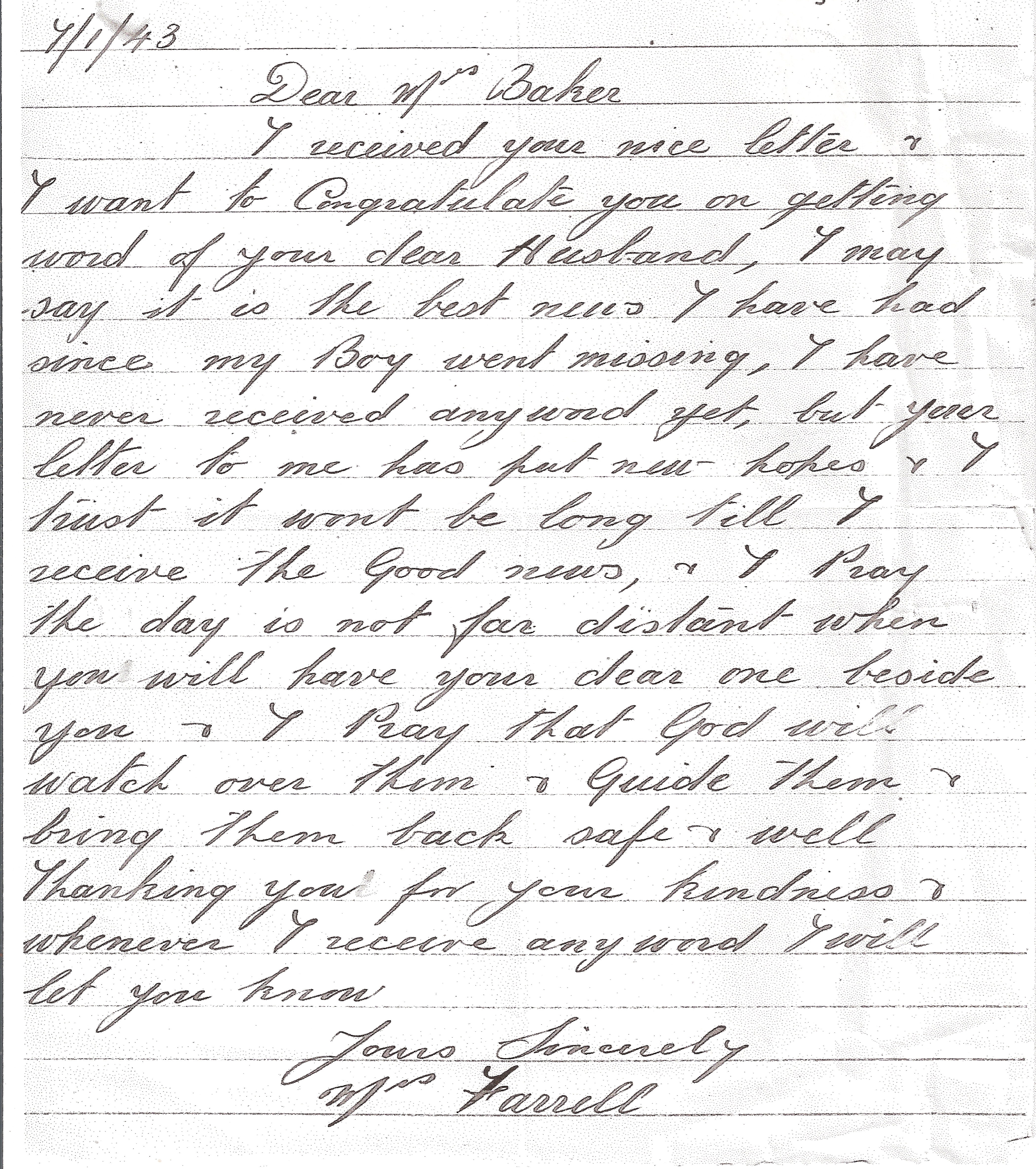 My very kindest regards & wishes for your husband’s speedy return. Yours Sincerely. Marjorie Parker.