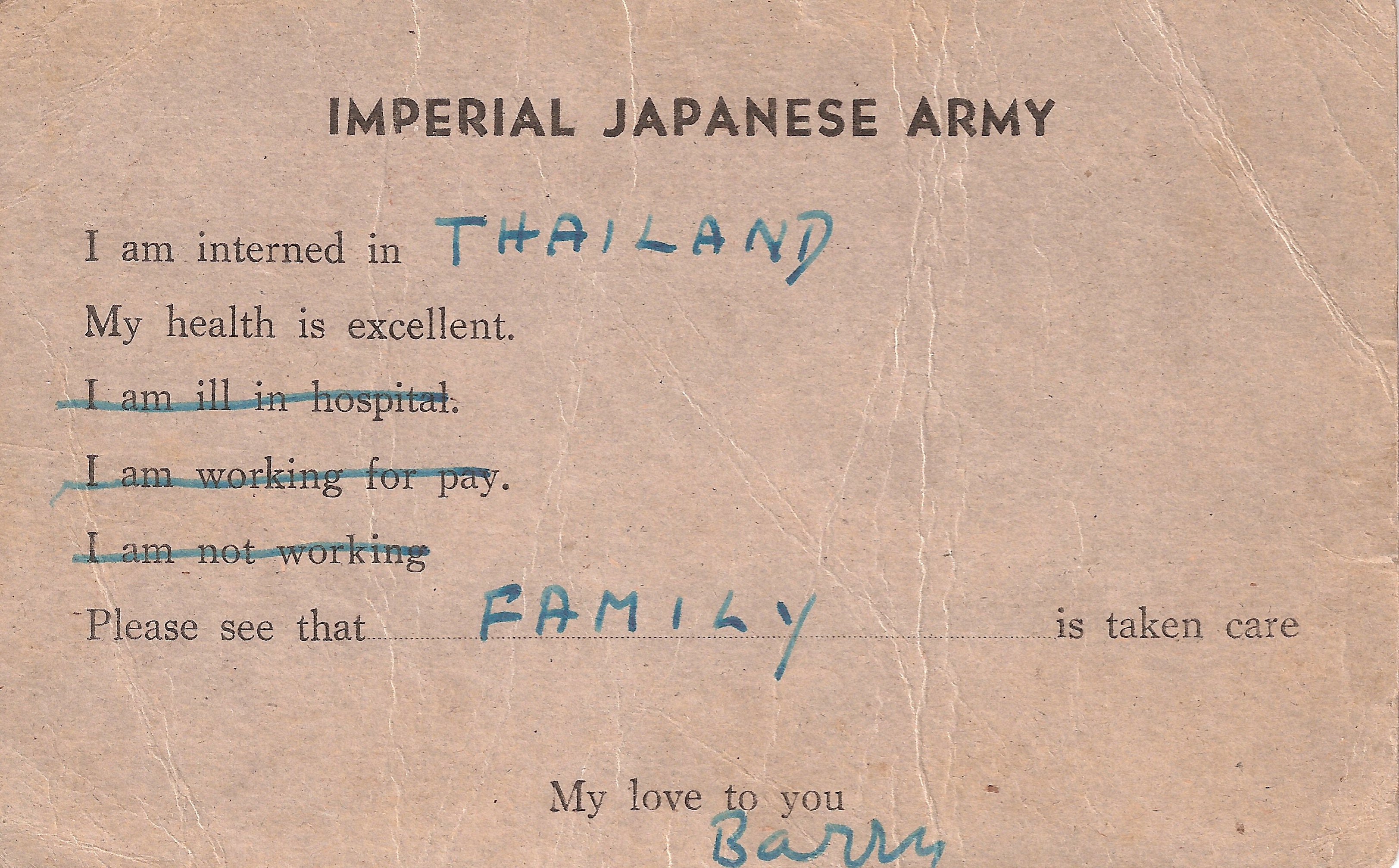 While devastating for this family, this information may have given false hope to others, thinking that if they had heard nothing their men were still alive and well. Phyllis, still without any direct communication from Barry since early 1942, keeps sending the brief permitted typed slips.