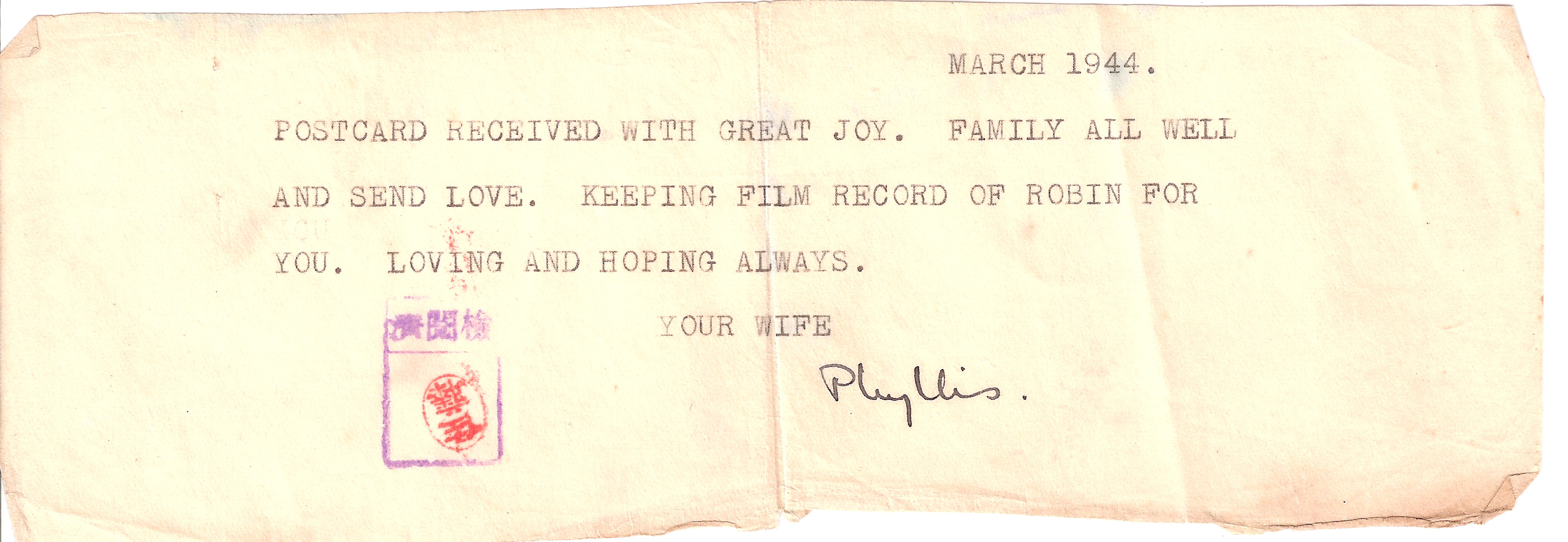 Sometime later in January 1944 Phyllis had her moment of hope, a POW card from Barry reached England. This was addressed to his parents house and the Post Office readdressed it across the Atlantic to Barry’s parents in San Francisco, where they were broadcasting to the Far East in Malay. This small card, having traversed the globe, reached Barry’s parents who then cabled Phyllis with the good news.
