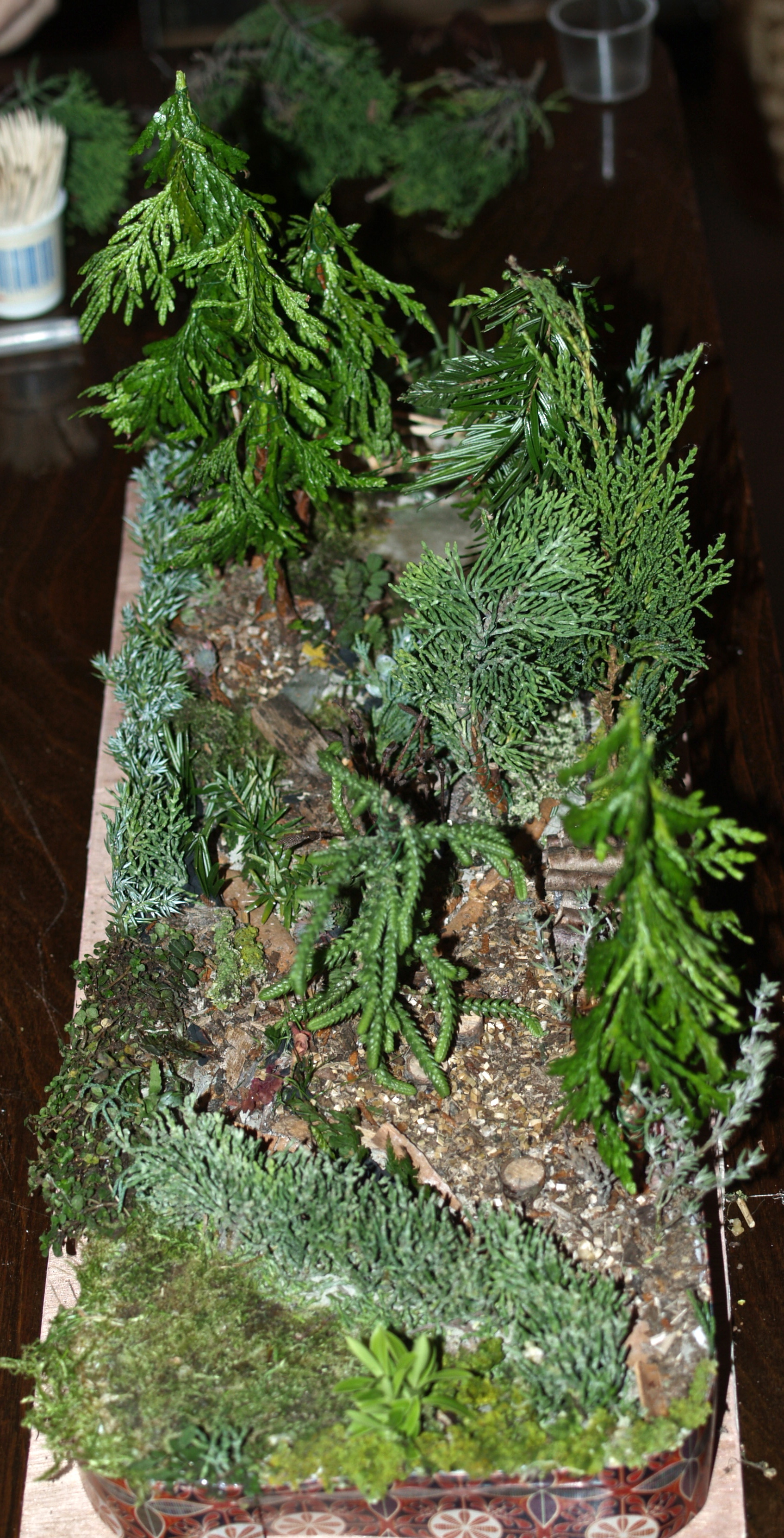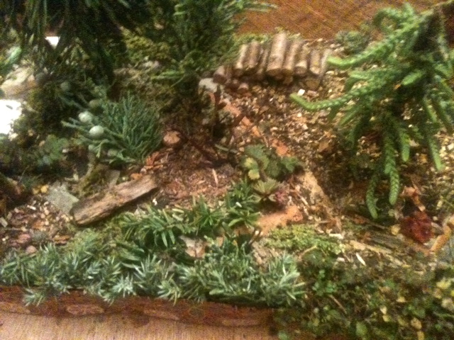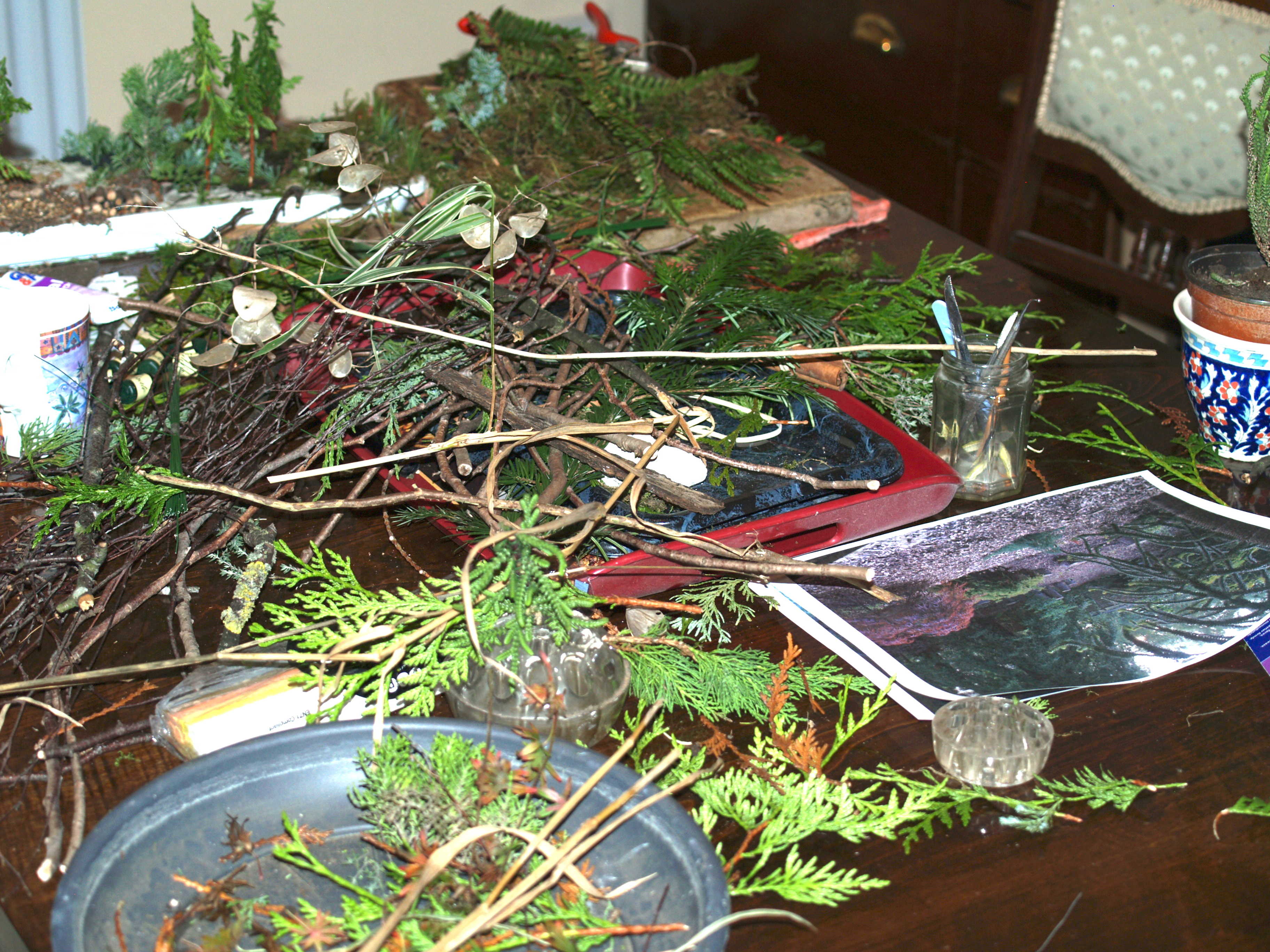 We were lucky enough to be invited to join dear friends for an evening meal on Christmas Day – our contribution to be a table decoration. As their garden is a quite spectacular evergreen forest, including redwoods, we tried to play on this theme.