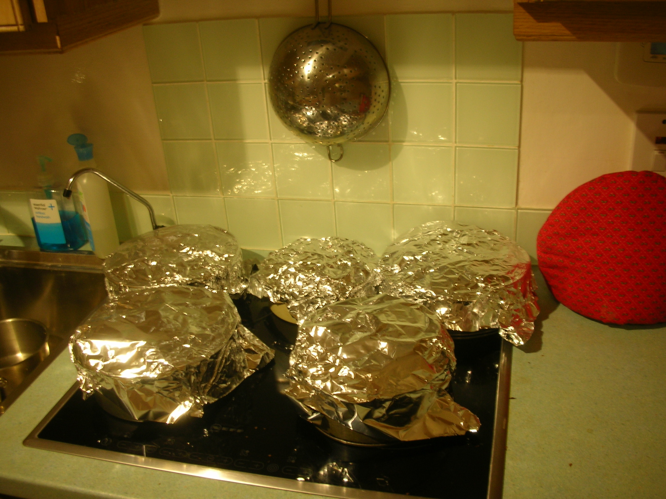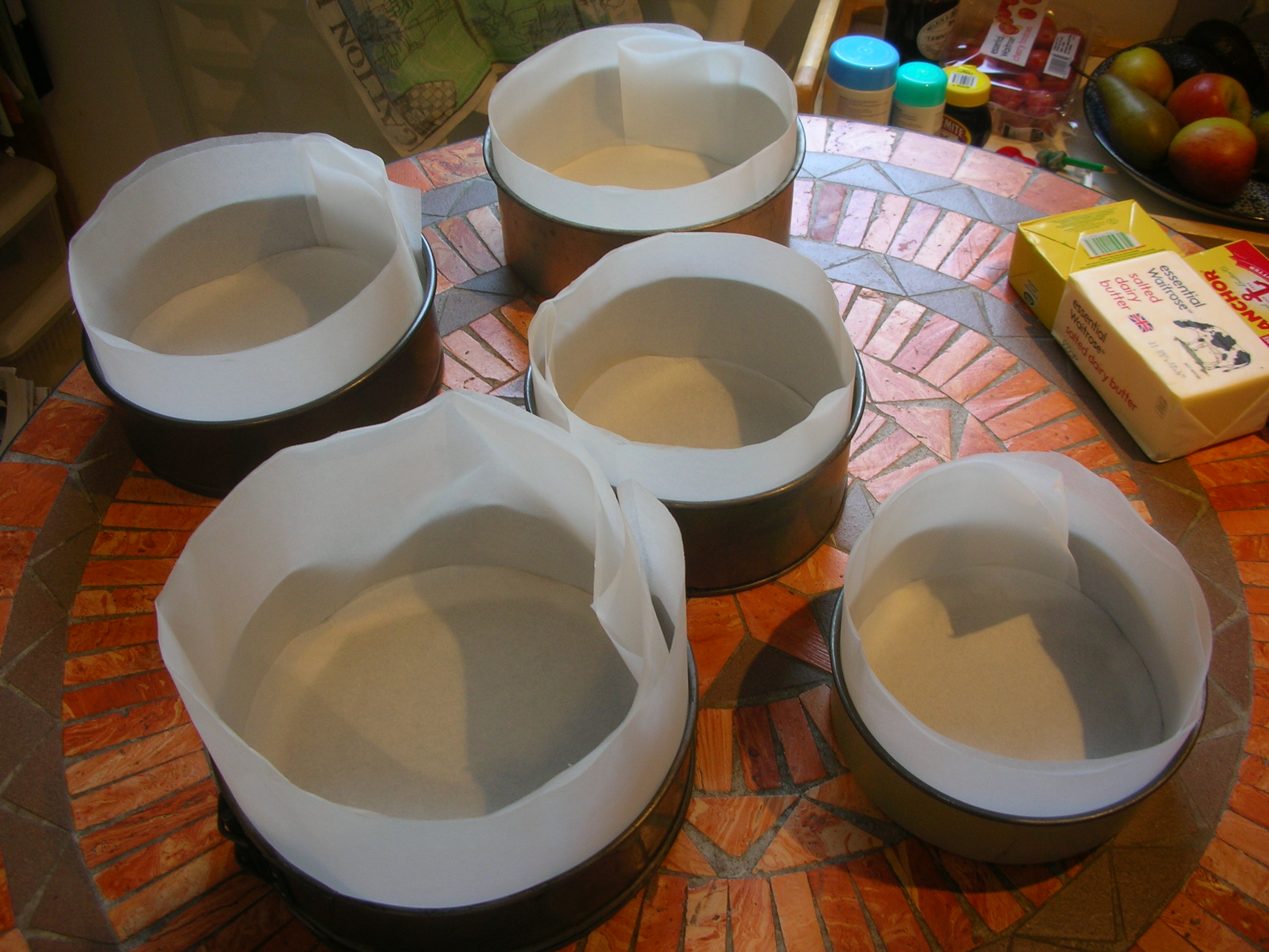 I found five suitable tins, did some maths, but stupidly did not really take in the quantities I was juggling with, and started mixing currants, raisins, sultanas, glacé cherries and candied peel prior to soaking them in brandy.DSCN6648Of course, I didn’t have containers built for this scale of catering, but after a sticky 20 minutes, managed to mix the fruit fairly evenly for overnight brandy-soaking.DSCN6653 Next afternoon my task started with preparing the tins – I’m a dab hand at this, but it takes time.DSCN6671 I’m finally about to get started when the Broadband engineer arrives. We don’t normally keep the phone and the router in the kitchen, but our main telephone socket is there and and our internet provider is insisting we use this socket until the problem (now three months old and this is the fourth engineer to visit) is sorted. I clear the table. After an hour the engineer has (Halluljah!) taken router and phone to husband’s desk.