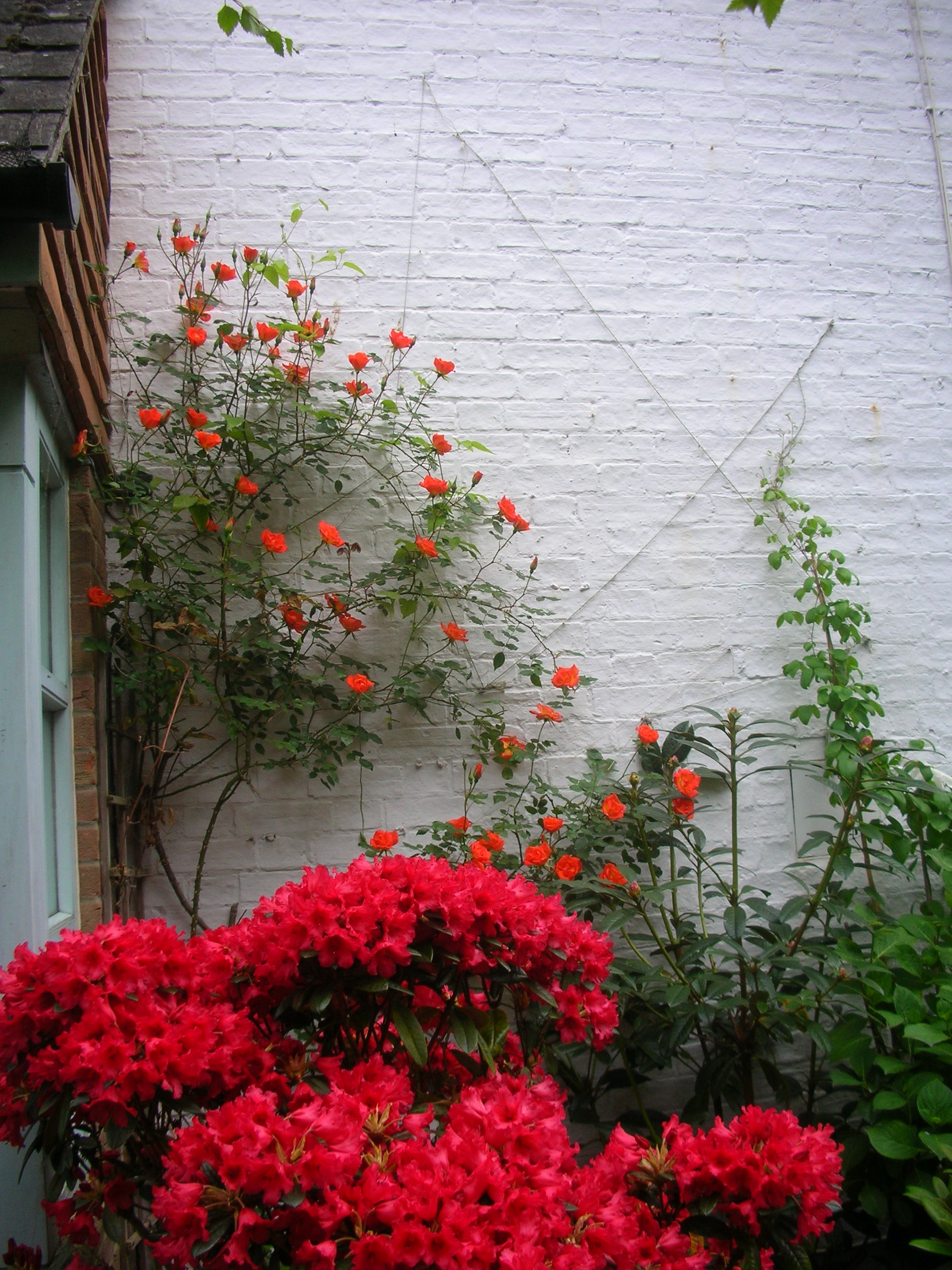 DSCN7789In April this tub was empty and on May 3 it looked like this. DSCN7572 A pink peony, name unknown.DSCN7776 Rosa Warm Welcome (beautifully scented and very prickly) above rhododendron Yakushimanum Titian Beauty.DSCN7771