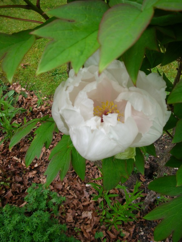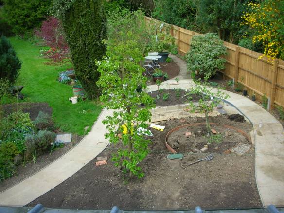 The photo below shows where we have got too now. We are waiting for the stone steps and the resin-bound surface on the path. Meanwhile I am digging the old bricks and flints out of the area to be grassed. The turf will be delivered next week and we must lay it within two days. I am enjoying building the path around the little apple tree, but am very frustrated about the endless delays on the work that was going to take ‘three to four weeks’ and started in February. I know it will be finished one day.